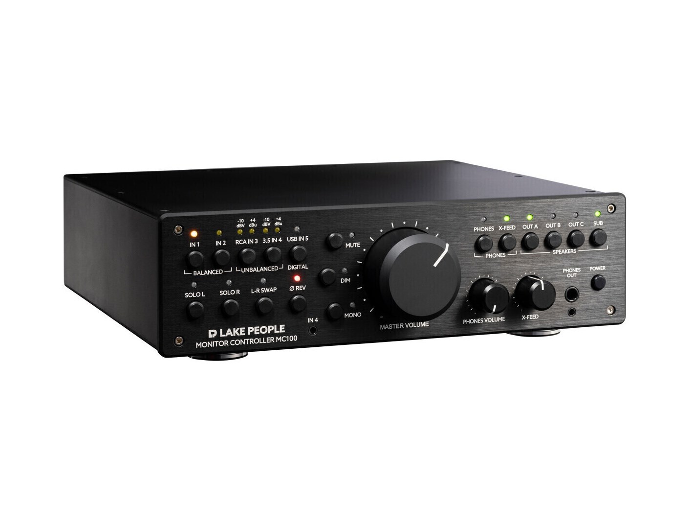 Lake People Monitor Controller MC100 - это функциональное устройство, включающее пять входов, высококачественный USB-вход с цифро-аналоговым преобразователем, два ведомых выхода, три выхода на динамики плюс выход на сабвуфер, а также выход на наушники с функцией X-Feed.