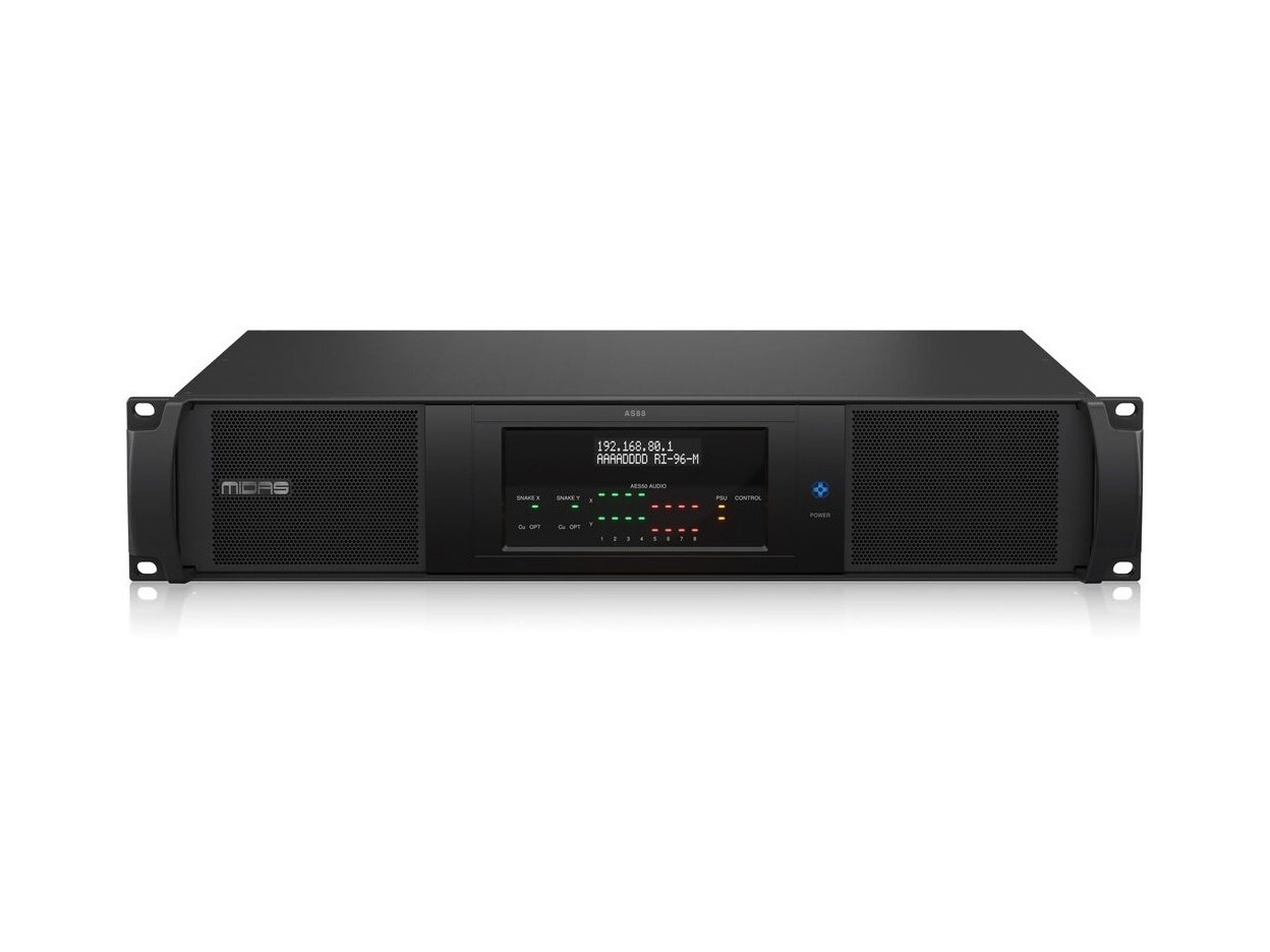 Midas AS88 предназначен для беспроблемного преобразования двух высокоскоростных соединений HyperMAC в восемь полностью резервированных соединений AES50 и наоборот, обеспечивая при этом сверхбыстрое переключение аудиосигнала. Созданный для обеспечения скорости и надежности, AS88 также поддерживает до 192 двунаправленных каналов с частотой 96 кГц.